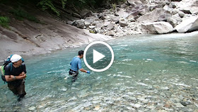 膝くらいまで水に浸かりながらさくさくと大きな岩と小滝を通り抜けて行きました。水がとても冷たく、朝からお腹の調子がよくないのであまり濡れたくないと願いながらもいきなりの深水。えーーー、勘弁してくださいという調子でどうにか濡れない様に努力をして行きました。(でも前3人はこんな感じ)
