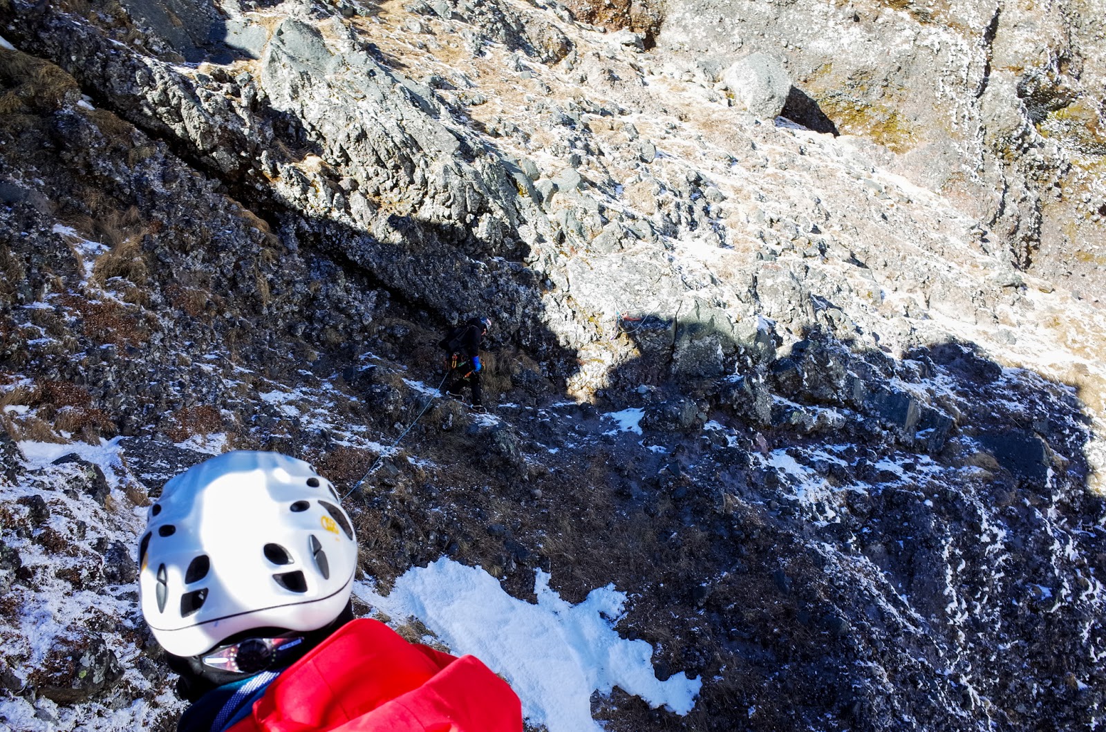 2p目の出だしでちょっと震えたけどホールドも支点もたくさんあり、なんならピナクルで支点もとれるのでペーペーにはアイゼン登攀の良い練習ルートだった。